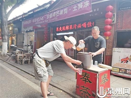 这个奉茶点,一年365天,全年无休,即便是今年年初疫情最严峻的阶段,老板泉州市第六届道德模范陈建国还是每天照旧开门,只为了奉茶。免费奉茶,他已经做了20年。“很多人都说,我自己在卖饮料,还在门口奉茶,好像很不会算账。”陈建国说,其先祖是在泉州有近300年历史的名药“老范志神曲茶”的创始人吴亦飞,几代人一直在观音宫前奉茶,奉茶作为一种家风传承到他这里不能断。