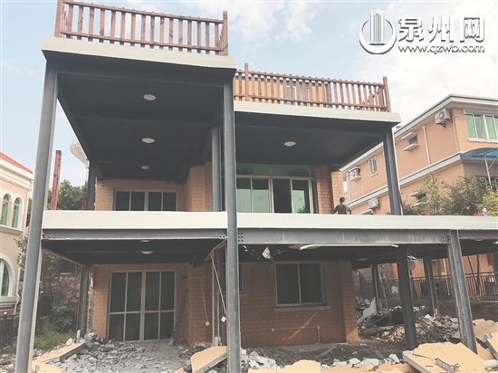 这处违法建筑位于丰泽区东海街道宝珊花园海康路18号。记者看到,这是一幢别墅,违建业主在别墅后面及侧面的空地上违法加建,大门前已盖起两层,侧面盖起一层,别墅的上面也加盖了一层。执法人员利用大锤等工具进行破拆。
