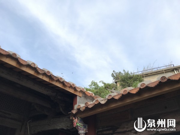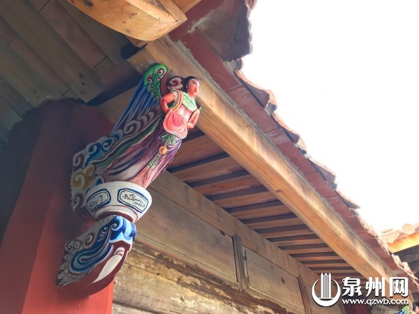 老房大厅前有一方“天窗”,四周屋檐上则雕刻有飞天仕女,与开元寺的飞天一模一样。傅氏后人介绍,因为傅维早曾参与开元寺修复工作,对飞天雕刻了如指掌,情有独钟,将这一绝世佳作,复刻在自己的宅院上,这在闽南古厝中显得极为罕见。