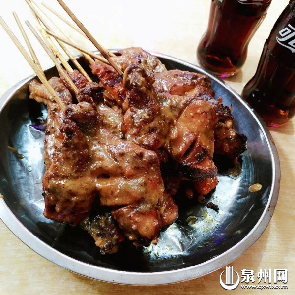 老板开店比较任性,下午两点半开卖,卖完收工,烧烤内容包括鸡腿、鸡翅、鱿鱼须、五花肉、蔬菜等,招牌自然就是烤鸡腿了,辅之以老板自己秘制的烧烤调料,端上桌来,烤鸡腿酱汁丰润,还有浓郁的花生酱味道,是许多觅食客们的必点之物。
