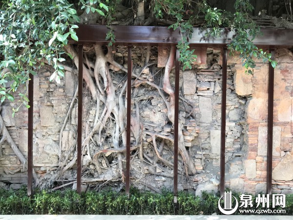 裸露在墙外的老树根,加上建筑小品,相得益彰