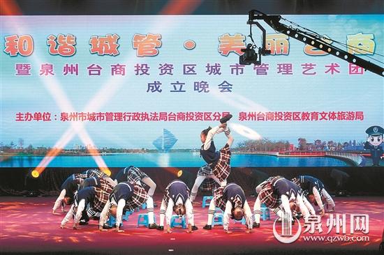 由泉州晚报社指导,泉州市城市管理行政执法局台商投资区分局、泉州台商投资区教育文体旅游局主办的“和谐城管·美丽台商”暨台商区城市管理艺术团成立晚会,上周六晚在张坂中学大礼堂如期举行。精彩的节目,到位的演绎,吸引了1000多名观众到场参加。据悉,以成立艺术团的形式,进一步拓展宣传城市管理工作,这在全国城管系统中还是第一次。