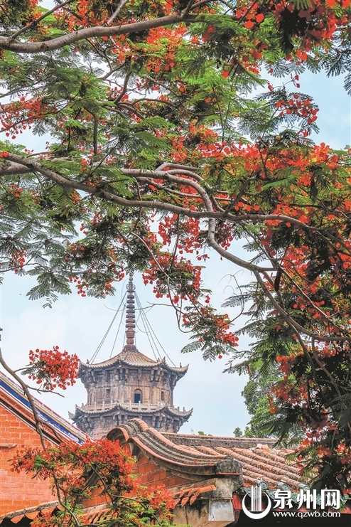 眼下,中心市区开元寺、承天寺、刺桐公园等地的凤凰木花开正艳,一团团、一簇簇的凤凰花在枝头“燃烧”,扮靓了城市。图为记者在开元寺东塔附近拍摄的一幕,画面中的塔是西塔。(陈起拓 摄)