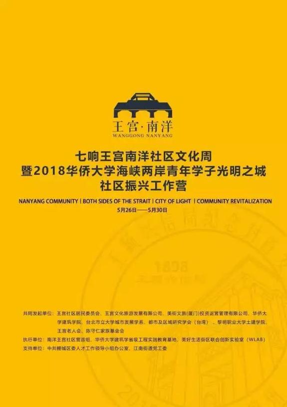 为深入贯彻习近平新时代中国特色社会主义思想和党的十九大精神,实施乡村振兴战略,落实全市“深化泉台人才交流合作”专项行动,进一步推动人才“港湾计划”落地见效,鲤城区与华侨大学建筑学院共同举办“七响王宫南洋社区文化周暨2018海峡两岸青年学子光明之城社区振兴工作营”活动。此次活动吸引了来自华侨大学和台湾台北市立大学、台北科技大学、逢甲大学、铭传大学、中华大学等两岸六所高校的近70名师生参与,共同为推广南洋及乡土文化,借鉴台湾社区营造的成功经验提升我区古城“双修”和社区改造的工作水平出力。