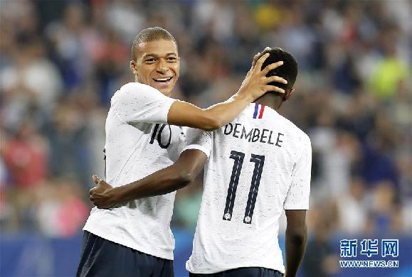 6月1日,法国队球员姆巴佩(左)与队友登贝莱庆祝。当日,在法国尼斯进行的国际足球友谊赛中,法国队以3比1战胜意大利队。 新华社/欧新