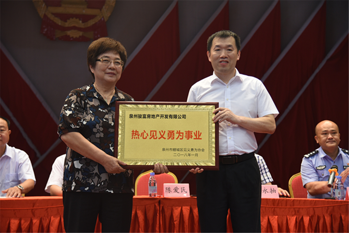 会上,陈爱民副区长为泉州骏富房地产开发有限公司颁发“热心见义勇为事业”牌匾。区见义勇为人员奖励和保护工作委员会授予许子发等11人“鲤城区见义勇为先进个人(群体)”荣誉称号,陈燕飞常委等领导为受表彰人员颁奖。