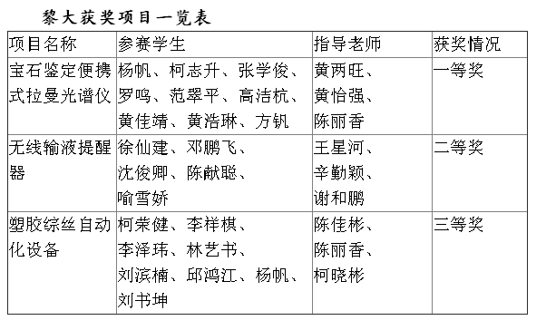 8月17日,2018年“挑战杯——彩虹人生”全国职业学校创新创效创业大赛决赛在南京江宁体育中心落下帷幕,黎明大学总成绩名列福建省高职院校第一。其中,黎明大学学生项目《宝石鉴定便携式拉曼光谱仪》荣获一等奖,《无线输液提醒器》荣获二等奖,《塑胶综丝自动化设备》荣获三等奖。