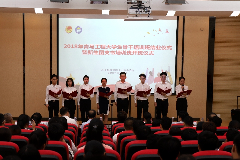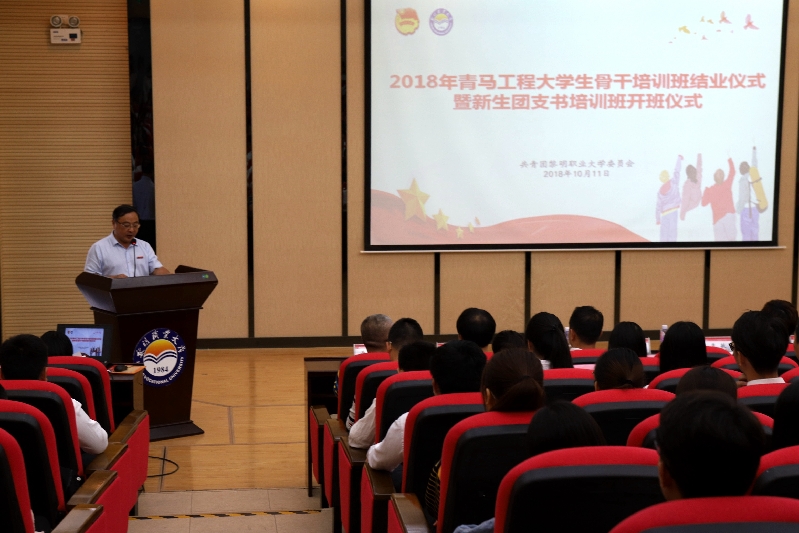 10月11日下午,2018年“青马工程”大学生骨干培训班结业仪式暨新生团支部书记培训班开班仪式在慈山学术报告厅举行。校党委副书记庄一民、党务工作部、学生工作部(处)、马克思主义学院负责人以及各学院党总支书记、团总支书记出席仪式活动。校团委书记郭旭明主持。