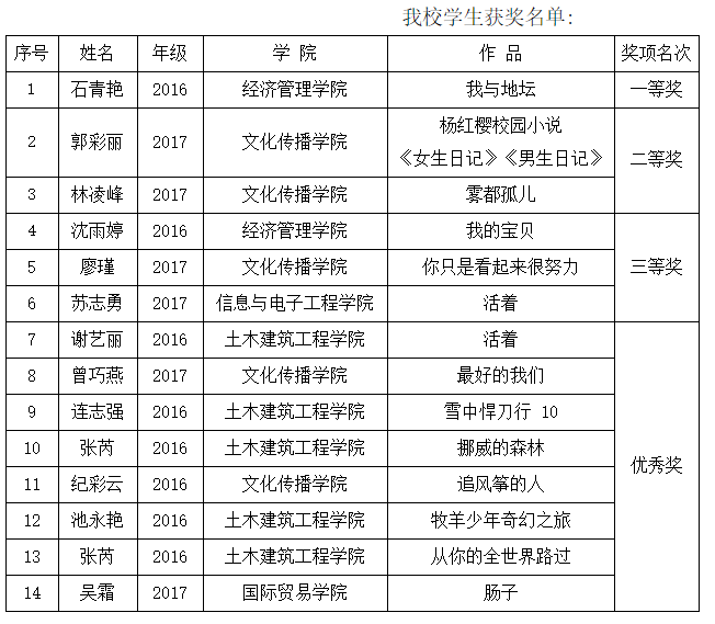 本次大赛共吸引了本省28所高校4500余名同学参加,书评作品达到5900多篇,250名读者获奖。图书馆经过大力宣传、精心组织,筛选并推送了308篇书评作品参赛,共有13名学子14篇作品在比赛中斩获名次(其中获得一等奖1名,二等奖2名,三等奖3名,优秀奖8名)。