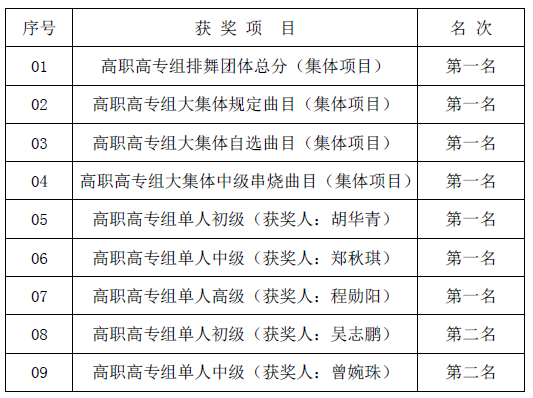 10月19日-21日,黎明职业大学排舞队参加2018年“舞动中国——排舞/广场舞联赛”(福建赛区),荣获团体第一名4项、个人第一名3项和个人第二名2项,排舞队由通识教育学院院长张宁、副院长范果担任领队,张宁、洪静静、黄艳、李秀娟、迟善娇等5位老师担任教练。