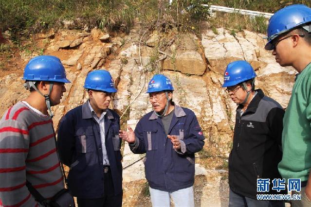 南仁东(左三)与工程技术人员在位于黔南州平塘县的大窝凼施工现场检查施工进展(2014年12月1日摄)。 新华社发(中科院国家天文台供图)