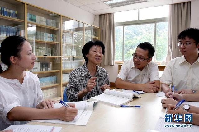 于漪(左二)和上海市杨浦高级中学的年轻教师们交流(2009年9月4日摄)。 新华社记者 刘颖 摄