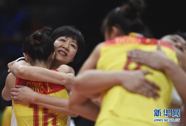 2016年8月20日,中国队主教练郎平(左二)在2016年里约奥运会女子排球决赛战胜塞尔维亚队夺冠后与队员拥抱庆祝。新华社记者李尕摄