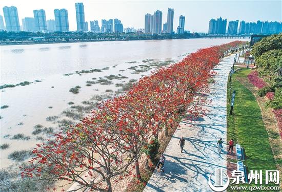 刺桐花开别样红!在丰海路晋江大桥附近,刺桐花依旧怒放枝头,无论是在旭日初升的黎明,还是在落日余晖的黄昏,总能见到它充满生机、纯洁神圣的倩影。而市区北滨江公园内新建有一条3.6公里长的刺桐大道,遍种刺桐树,简直是一条刺桐花走廊,满树的刺桐花看过去就像一片片红霞,异常美丽,春天里,引来不少款款漫步的市民踏歌叫绝,流连忘返,纷纷拿起手机,争先拍下美丽的刺桐花,人与自然完美协调之佳景尽收眼底。