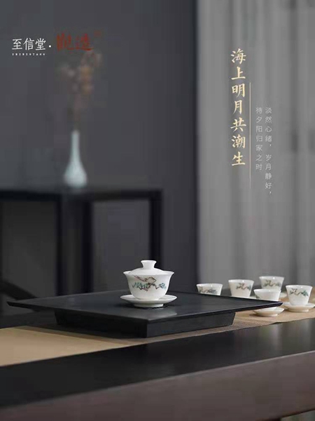 新中式系列“海上明月共潮生”造型不占位置 ,小而精巧,清新风格,既有新中式温婉,又不失淡淡禅韵,独具魅力。“小而精”符合现代小年轻对家居茶艺的追求 ,整体风格涵盖东方传统人文和当代美学色彩与传统手工工艺,营造一款静谧、简美的家居生活茶器。