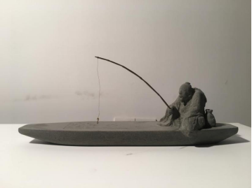 说明:作品借一位独坐小舟的钓者,手持钓竿中反挂的钓勾成了“?”。这位钓者在问什么,其实只有你和他知道。