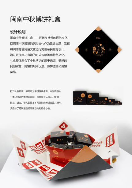 闽南中秋博饼礼盒——可随身携带的民俗文化。以闽南中秋博饼的民俗文化作为设计主题,将闽南特色民俗文化进行简便亲民化的设计,通过更加灵巧有趣的方式传承闽南特色文化。