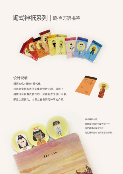 以闽南宗教和民俗文化为设计主题,选择闽南地区具有代表性的十位神明作为设计元素,形象上清新化,内容上除了有各闽南神明的介绍,还融入年轻人喜欢的趣味情话。系列包含“纸为你明信片”和“籤·言万语书签”,融合多种形式的互动,给客人带来惊喜感。