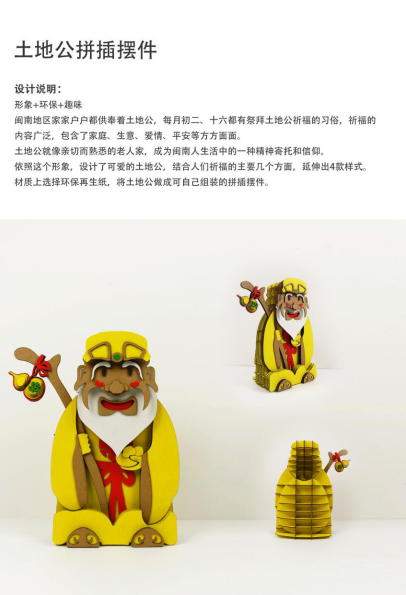 闽南地区家家户户供奉土地公,每月初二、十六有祭拜土地公祈福的习俗,祈福的内容广泛,包含家庭、生意、爱情、平安等方方面面。土地公就像亲切而熟悉的老人家,成为闽南人生活中的一种精神寄托和信仰。依照这个形象,设计可爱的土地公,结合人们祈福的主要内容,延伸出4款样式。材质上选择环保再生纸,将土地公做成可自己组装的拼插摆件。