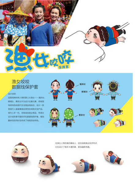 选取闽南特有人物形象三大渔女——湄洲女、蟳埔女、惠安女作为设计主要元素,将闽南传统特色和现代生活用品相结合,设计一款受现代人喜爱兼具实用性的闽南文创产品。现代人手一机,充电线也是必需品,将渔女设计成形象可爱的手机数据线保护套,在增加趣味性的同时也传承闽南民俗特色。