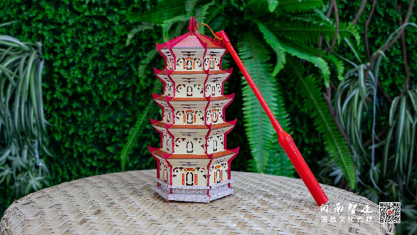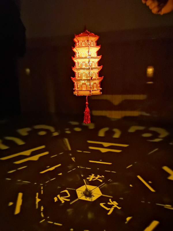 状元灯的材料主要采用硬纸片进行激光雕刻,彩色版的闽南传统屋瓦颜色勾勒出层层塔檐,红色版用中国红,又在小而美的红色对联上烫金,将喜庆的氛围慢慢释放。组装好状元灯后,打开电源,“状元灯”三个字便从灯的底部投射出来。