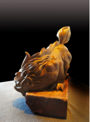 1.创作构思:以闽南“滴水兽”獬豸为原型,对原有闽南建筑构件功能性进行调整,塑造为家居摆件工艺品。传统造型上力求创新,底座为闽南清水古砖,表现闽南悠久的传统文化历史与特色。