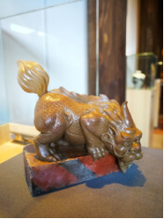 3.造型:獬豸又称獬廌、解豸(xiè zhì),是中国古代神话传说中的神兽,体形大者如牛,小者如羊,类似麒麟,全身长着浓密、黝黑的毛,双目明亮有神,额上通常长一角。拥有很高的智慧,懂人言知人性。它怒目圆睁,能辨曲直,是勇猛、公正的象征。
