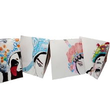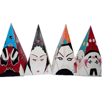 3.造型:底部为高甲戏人物净生旦丑(从左至右)肖像图,每个盒子四个面分别画上同一角色不同形象,如旦角可分为青衣、花旦、老旦、刀马旦,生角大致可分为老生、小生、武生、娃娃生。锥形作品节约空间,人性化的侧面开口,符合现代人的生活习惯。