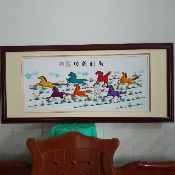 我在生产制作金苍绣刺绣品时,常常剩余一些边角碎缎,我就想用这些碎缎构思创作一些积极向上、群众喜闻乐见的工艺品,比如”马到成功”、“年年有余”。作品利用各种颜色的碎缎布,用刻刀一刀一刀在缎布上刻出骏马的各种造型、花草等,然后用笔在刻好的马身上画出轮廓和各部位的线条,再用棉花填充马身体,使之凸浮形成立体状,然后把这些做好的马和花草用乳胶粘好,贴在镜框的布上,“马到成功”就做好了。