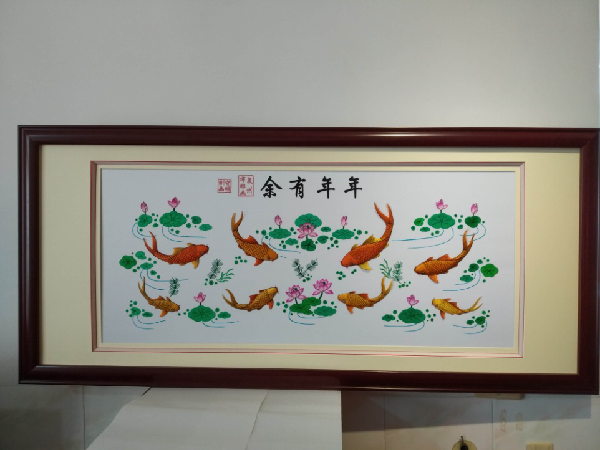 “年年有余”的鲤鱼和水草、水波和莲花也是用手一刀一刀在缎布上刻出来,画好轮廓,鱼做立体状用乳胶粘贴在镜框布上。