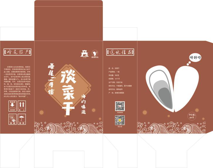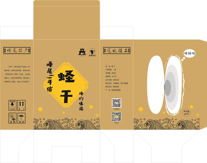 在系列伴手礼外包装上,巧妙融入闽南古大厝红砖红瓦和燕尾屋脊等闽南建筑元素,并结合峰尾海城海浪及海鲜干货卡通图形,透明镂空的设计使人一眼望见里面的产品,买得放心。