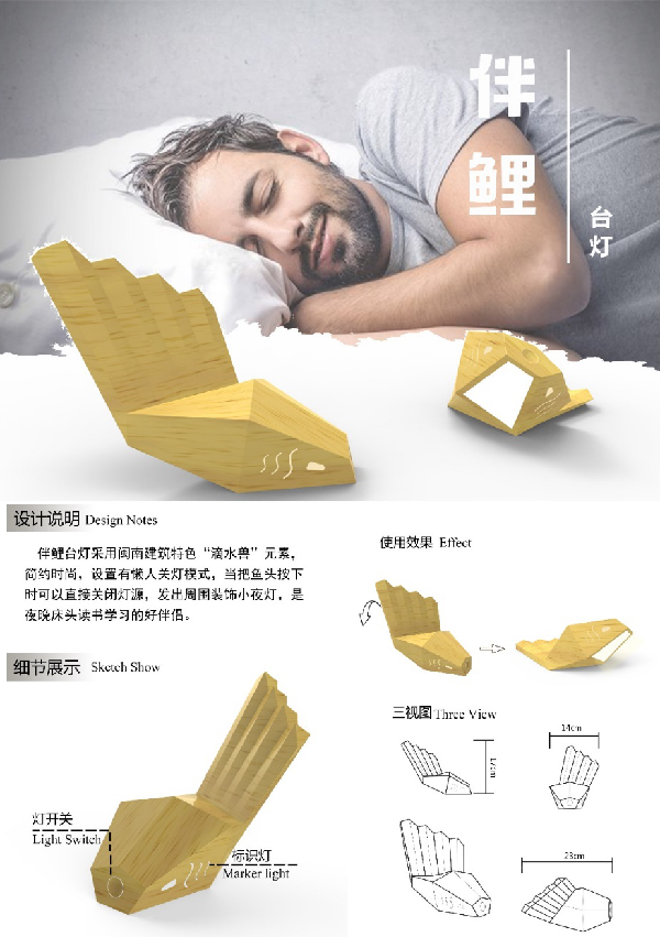 采用闽南建筑特色滴水兽(如图)、鲤鱼造型进行设计,整体采用几何化结构,让产品更活泼时尚。同时采用木质工艺,更贴进自然绿色环保。灯的底部是一个照明台灯,当鱼头朝上时灯可以打开,有一种鱼跃龙门的姿态,也是送人好礼,寓意可以高就。当灯头朝下时,灯自动关闭,两侧的示廓灯可以继续开启,便于夜晚找到台灯,是人们日常生活的小伴鲤(侣)。
