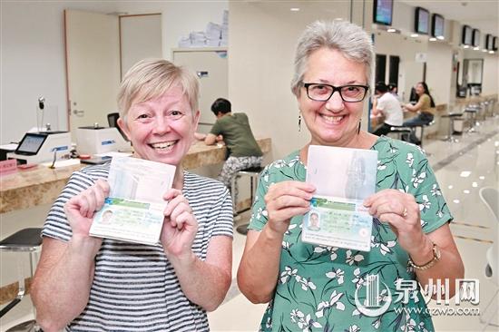 本报讯 (记者颜雅婷 陈起拓 文/图)从一年一签到五年一签,迅速落地的12项移民和出入境便利政策措施,让在泉州工作生活的外籍人士感受到第二故乡的友好与亲切。3日上午,在市行政服务中心出入境服务大厅外国人受理窗口,泉州某语言培训机构的外教Janet和Kim,从民警手中接过新鲜出炉的5年有效期《外国人居留许可》。