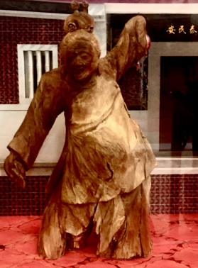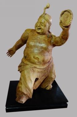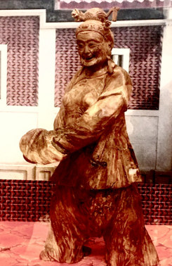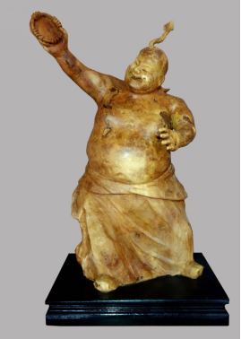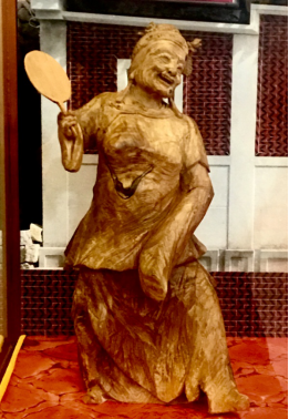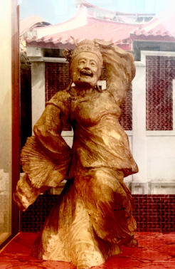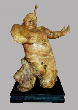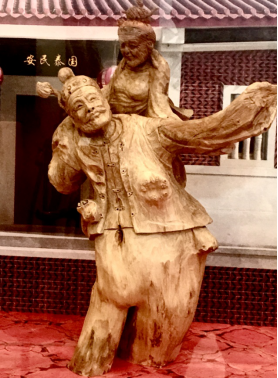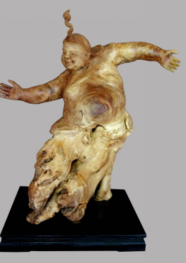 《闽南家婆》作品利用木头的天然形态雕刻出闽南戏曲中“家婆丑”的形象,她身穿大襟杉,下着宽筒裤,头盘高发髻,手持红手帕,搔首弄姿,幽默诙谐,滑稽逗人。闽南家婆经常在泉州民俗庆典中出现,烘托欢乐喜庆气氛。