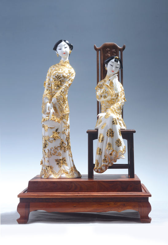 作品《淑逸闲华》呈现两位古典风韵女性人物形象,在创作服饰花纹过程中,旗袍采用中国传统艺术形象中常见的寓意吉祥的牡丹、凤凰飞天、祥云等图案元素,显得优雅而精致。作品中女性柔和的神态,典雅的旗袍点缀色彩柔和的花纹,华而不艳,充分展示东方女性内敛含蓄的特质。