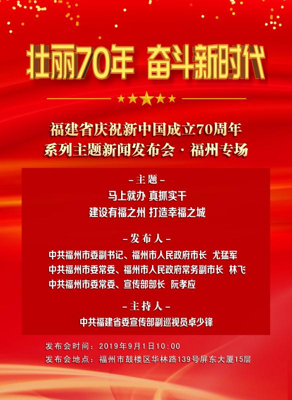 明天(9月1日)上午,福建省庆祝中华人民共和国成立70周年系列主题新闻发布会将在省政府新闻发布厅启动。首场发布会为福州专场,将邀请福州市委副书记、市长尤猛军,市委常委、常务副市长林飞,市委常委、宣传部长阮孝应围绕“马上就办真抓实干建设有福之州打造幸福之城”介绍有关情况,并答记者问。