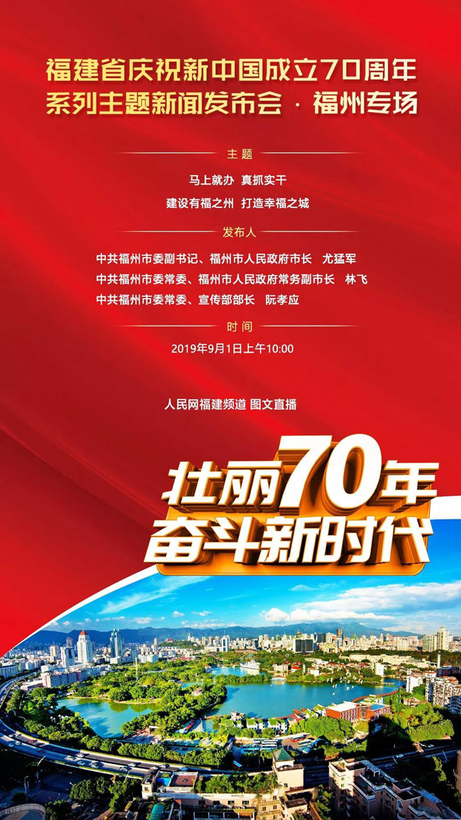 9月1日上午,福建省庆祝中华人民共和国成立70周年系列主题新闻发布会将在福建省政府新闻发布厅启动。