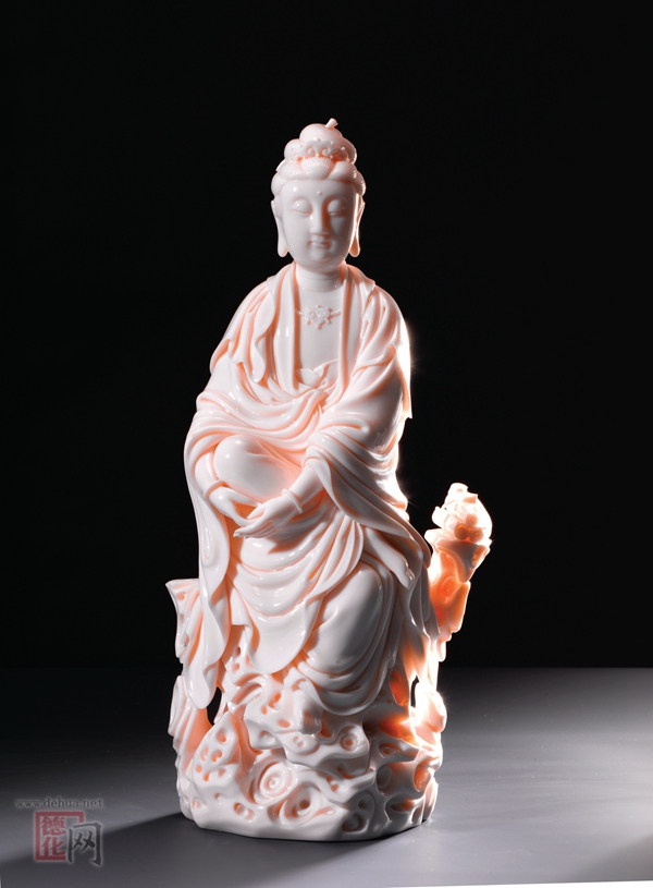 李建水创作的孩儿红瓷塑作品《坐岩观音》