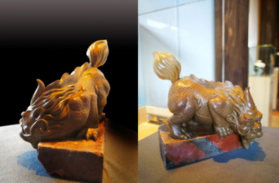 以闽南滴水兽獬豸为原型,对原有闽南建筑构件功能性进行调整,塑造为家居摆件工艺品。獬豸是中国古代神话传说中的神兽,能辨曲直,是勇猛、公正的象征。