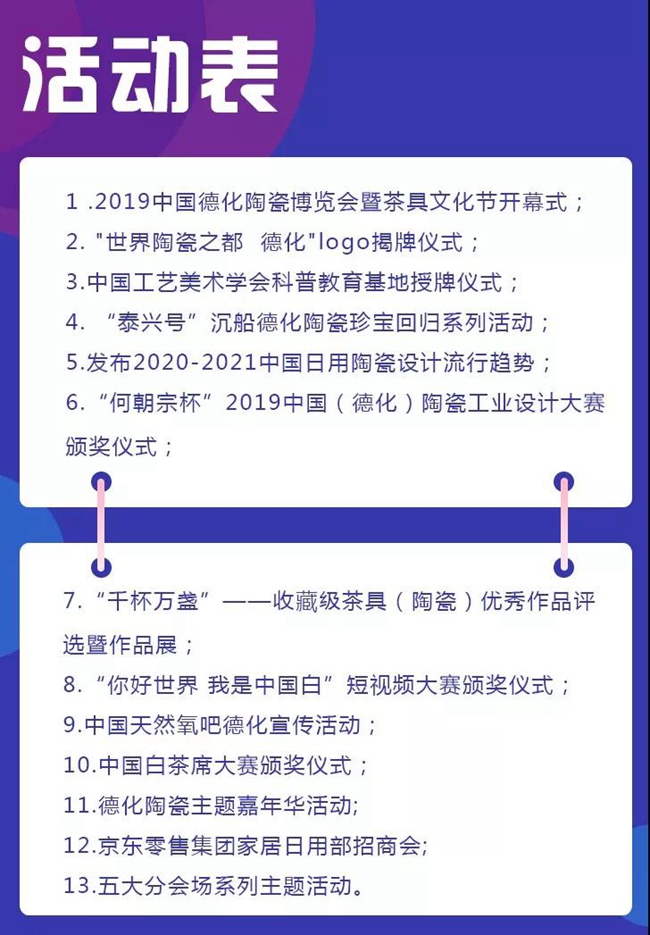 本届“一会一节”引入多场专业活动以及各类颁奖活动仪式,力求最大程度呈现一场专业化、高端化的白瓷盛宴。包括“世界瓷都之都·德化”logo揭牌仪式、中国工艺美术学会科普教育基地授牌仪式、“泰兴号”沉船德化陶瓷珍宝回归系列活动、发布2020-2021中国日用陶瓷设计流行趋势、“何朝宗杯”2019中国(德化)陶瓷工业设计大赛颁奖仪式、“千杯万盏”——收藏级茶具(陶瓷)优秀作品评选暨作品展、“你好世界我是中国白”短视频大赛颁奖仪式、茶席大赛颁奖仪式、中国天然氧吧德化宣传活动、德化陶瓷主题嘉年华活动等,不仅丰富展会内涵,以会促展,提高展会层次与深度,更是将历史文化与德化白瓷结合,将中国历史文化艺术之根植入瓷都德化,以展会活动的形式铺成,为业界人士带来一场惊艳绝伦的艺术之旅。