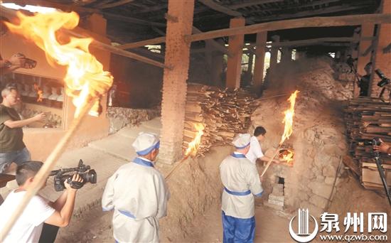 12日,“一会一节”系列活动之一的柴烧窑点火仪式在月记窑举行。窑工们手执火炬,移步到月记窑窑口,将火炬投入窑膛为柴烧龙窑点火。星星的火炬,点燃了龙窑浇火膛里的熊熊之火。