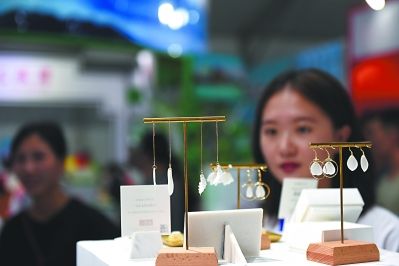 15日,在德化三班茶具城一展馆内,一组用德化白瓷制作的耳环、挂坠饰品吸引逛展的群众驻足欣赏。近年来,德化陶瓷企业纷纷在设计理念、材质、工艺上进行创新,并加强设计环节,注入文化元素,加速产业升级。(记者 黄琼芬 通讯员 李宏图 摄)