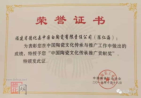 陈仁海(福建省德化县中国白陶瓷有限责任公司)荣获“中国陶瓷文化传承推广贡献奖”