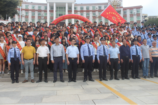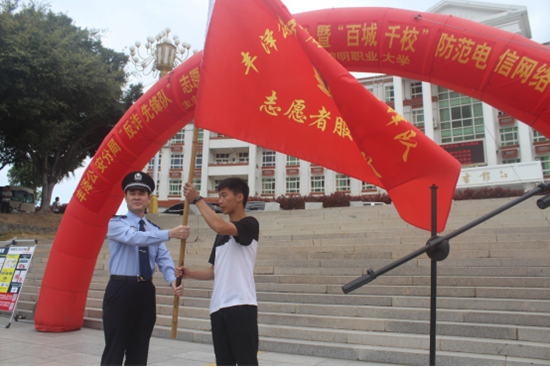 活动中,丰泽公安分局副局长庄辉煌作了电信网络诈骗形势致辞,希望大学生要积极加入反诈骗志愿者队伍,并给我校学生胡敏龙颁授了“反诈骗先锋队”旗帜。林昭永及分局领导为3名学生代表配带“反诈骗先锋队”绶带,学生代表许淑娟宣读了“防电信网络诈骗倡议书”,全体参加活动的学生当场宣誓加入“反诈骗志愿者”队伍。