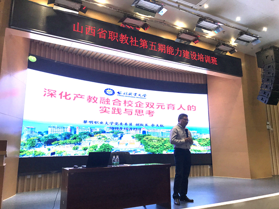 10月24日,山西省中华职教社骨干社员能力建设培训班在华侨大学法学院举行。我校余大杭副校长应邀为67名学员讲授题为“深化产教融合校企双元育人的实践与思考”的报告。