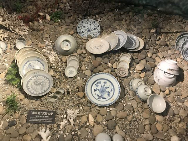 陶瓷博物馆一隅,设有两处特殊展柜。展柜中,珊瑚海草、残贝碎石,模拟而成的海底,如意纹青花瓷盘、圈点纹印花小碗等各式瓷器散落其间。这是从中国清代沉船“泰兴号”上打捞出的德化古瓷。