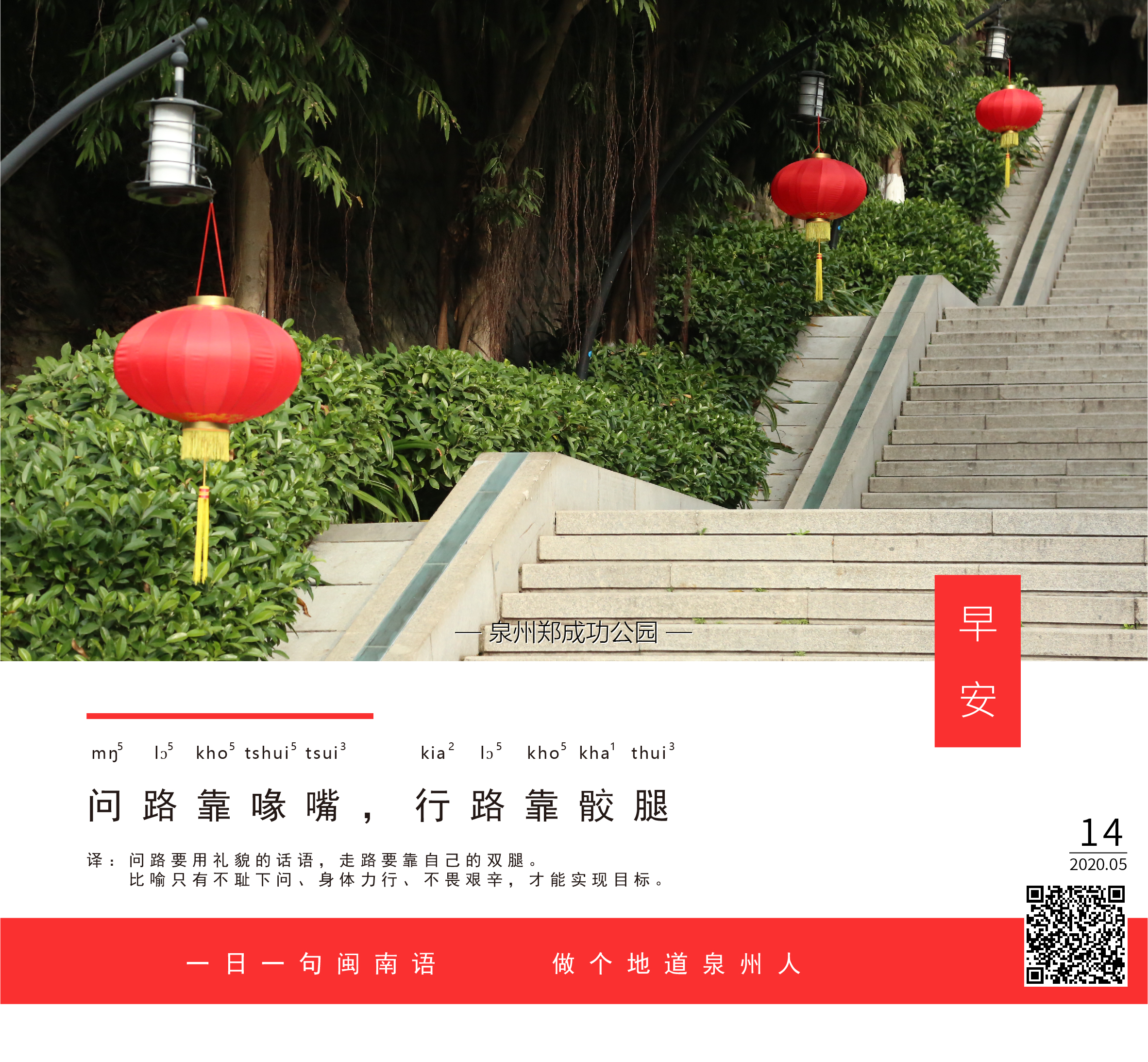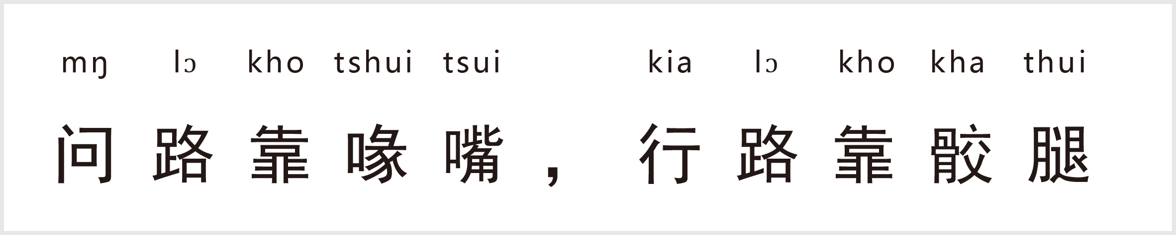 译:问路要用礼貌的话语,走路要靠自己的双腿。比喻只有不耻下问、身体力行、不畏艰辛,才能实现目标。