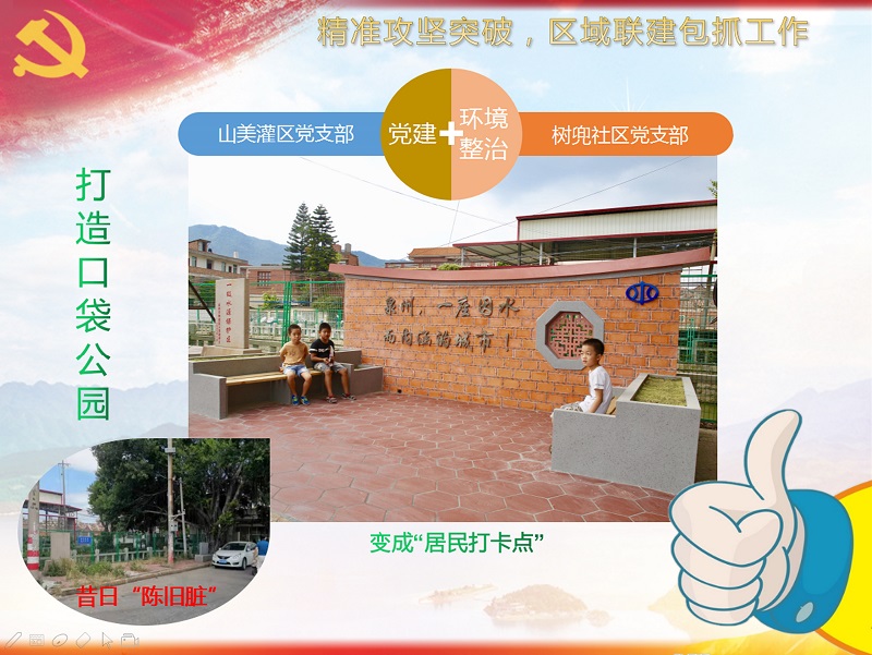 各联创党组织划分护水责任区,设立“党员先锋岗”和“党员示范岗”,建立任务清单、精准施策,合力传递水源保护“接力棒”。山美灌区党支部与鲤城区树兜社区党支部推行“党建+环境整治”,联手打造口袋公园,昔日“陈旧脏”,成了居民打卡点;市河长办临时党支部组建“党建+保护联盟”,专项整治水源地的“四乱”问题;晋江水利局机关党委、龙湖镇党委实行“党建+联合执法”,攻坚水源保护区违章搭盖乱象,取得实效。