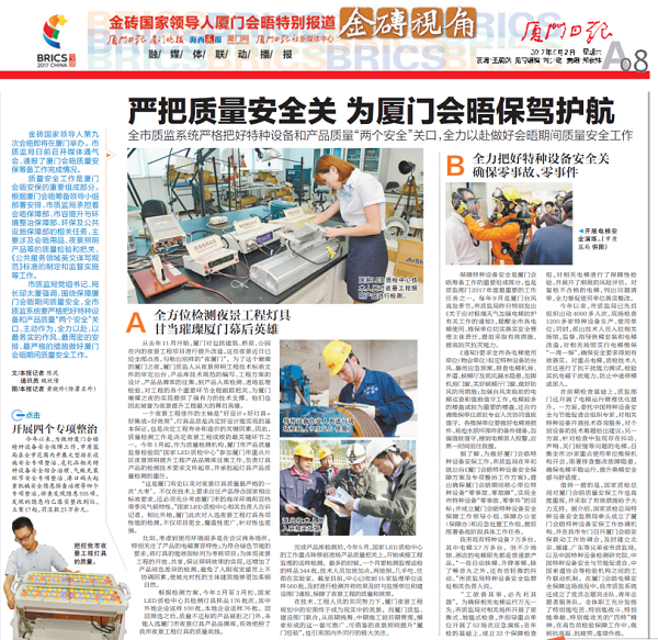 服务民生新需求。在服务厦门会晤、青运会、鼓浪屿申遗、金鸡百花奖等重大活动中,厦门质检充分发挥战斗堡垒作用,为政府担当质量参谋。“厦门会晤”中,厦门质检工作模式更是被响誉为“厦门模式”。一对一把脉,通过“立体化信息服务平台”、“创建民众满意的服务窗口”等形式,提速产业升级。今年,厦门质检及时为知名企业解决瓶颈难题,协助打造中国“芯”,共推5G时代的到来。