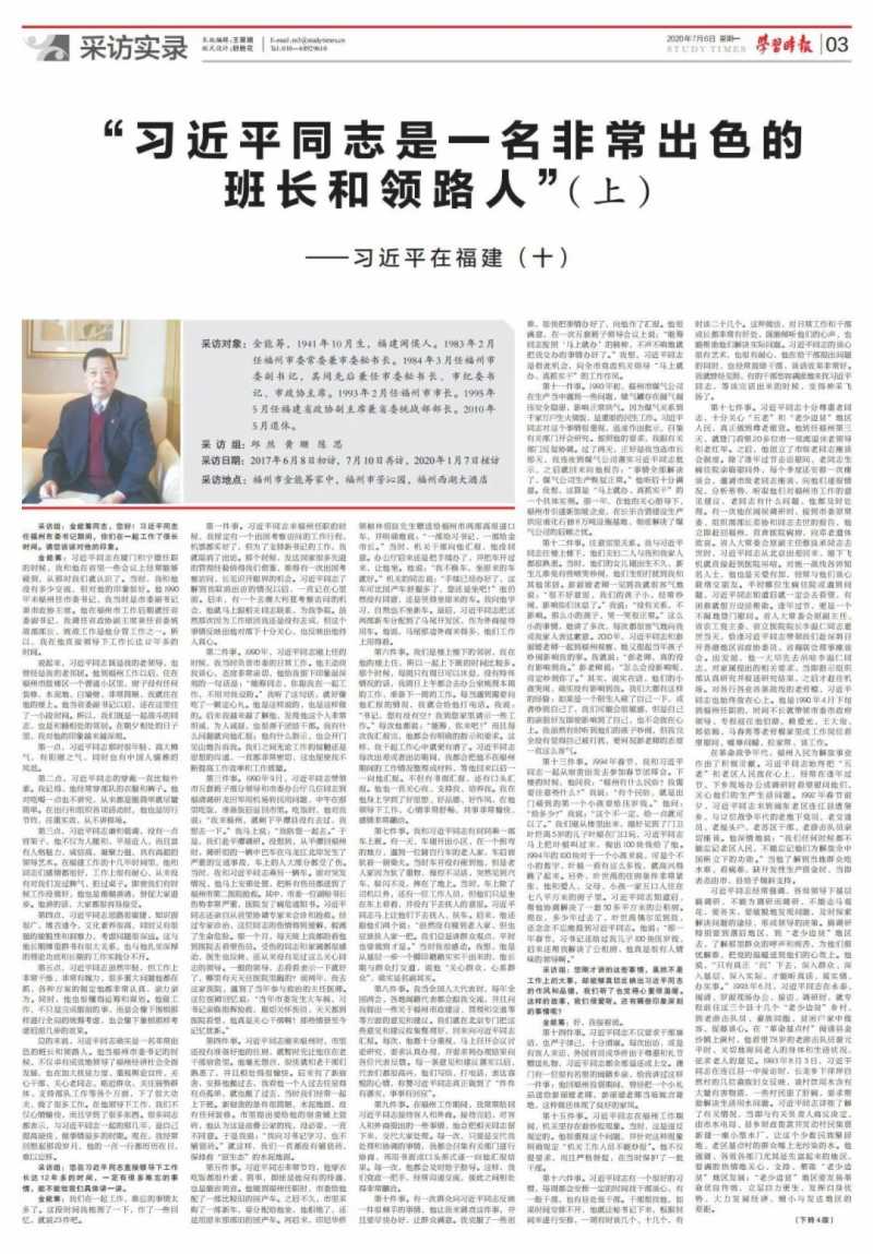 总的来说,习近平同志确实是一名非常出色的班长和领路人。他当福州市委书记的时候,不仅卓有成效地领导了福州经济社会全面发展,也在加大扶贫力度、重视舆论宣传、关心干部、关心老同志、贴近群众、关注弱势群体、支持部队工作等各个方面,下了很大功夫,做了很多工作。在他领导下工作,我们不仅心情愉快,而且学到了很多东西。很多同志都表示,与习近平同志一起的那几年,是自己提高最快、做事情最多的时期。现在,我经常回想起那段岁月,他的一言一行都历历在目,难以忘怀。
